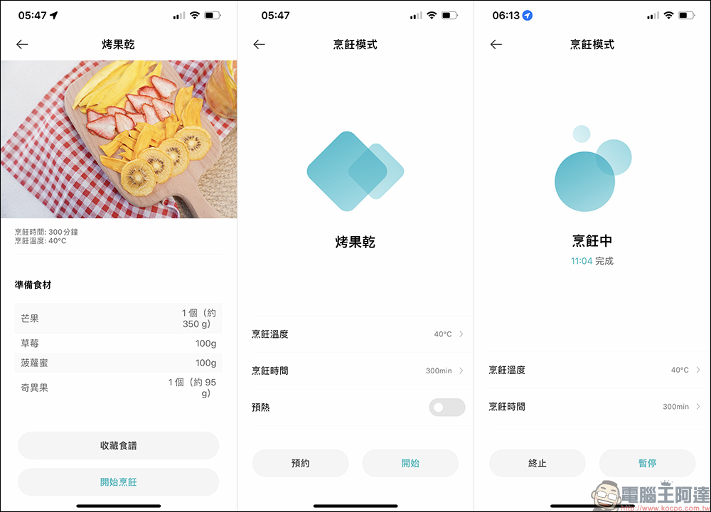 在米家 App 內建的線上食譜,選擇「烤果乾」就能看到完整的製作食譜。若水果較多,建議可在炸籃內放上烤架並將較大片的水果放置在上層。只需 40°C 低溫烘烤 300 分鐘,美味又健康的果乾就完成囉!