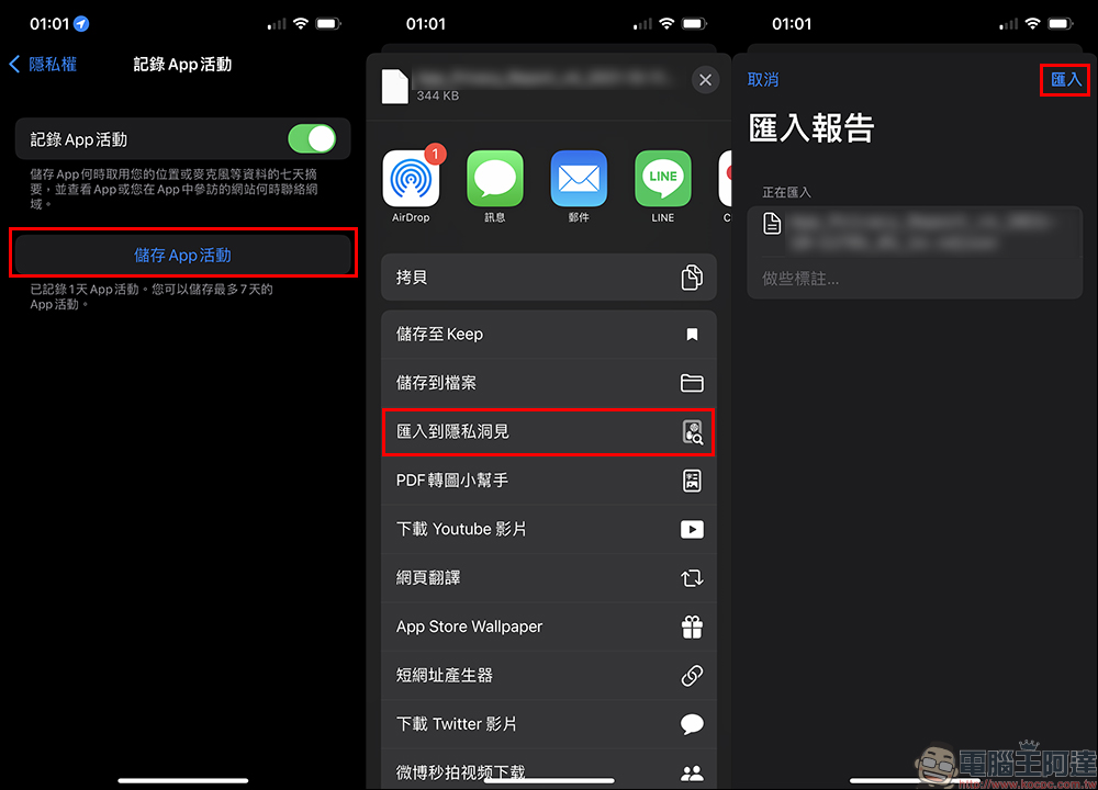 下載完成後,再次回到「記錄 App 活動的設定」並點擊「儲存 App 活動」。接著選擇「匯入到隱私洞見」並「匯入」。