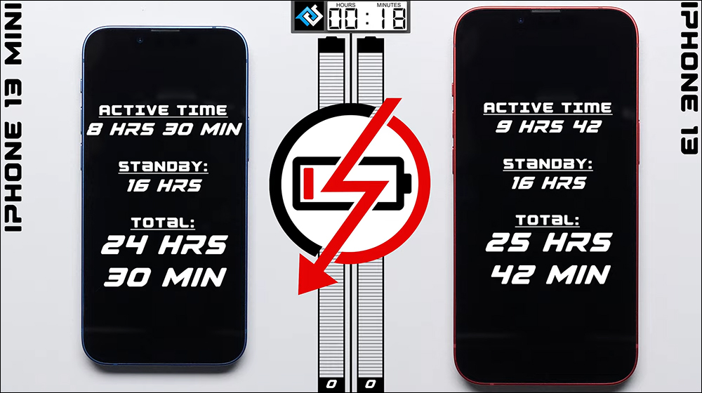 在 iPhone 13 和 iPhone 13 mini 電池續航對決的測試結果, iPhone 13 總續航 25 小時 42 分, iPhone 13 mini 總續航則為 24 小時 30 分鐘,兩者之間差距約 1 小時 12 分鐘的使用時間(上述時間皆將 16 小時休眠待機算入)。