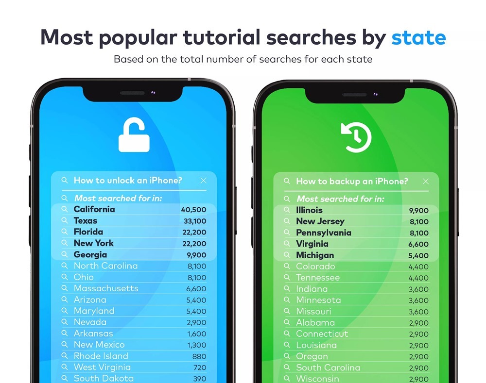 幾天前國外 Mackeeper 公佈一項「美國 Apple 用戶搜尋最多的教學」,iPhone 部分最受歡迎的的是「如何解鎖 iPhone」與「如何備份 iPhone」這兩個主題,尤其是前者,許多大洲都有破萬的搜尋量: