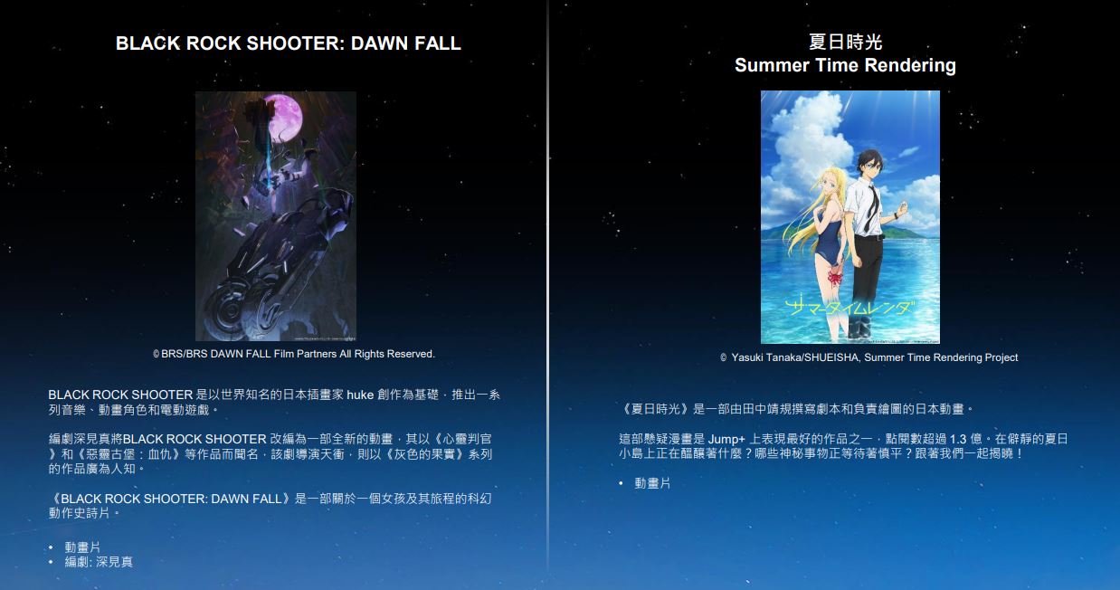 與日本TBS電視台特別合作的醫療劇,由獲獎演員鈴木亮平和賀來賢人主演。 - 《BLACK ROCK SHOOTER: DAWN FALL》