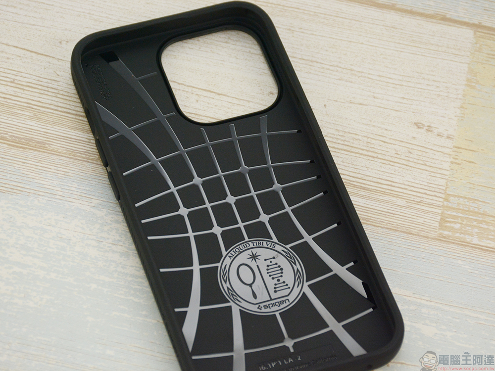內部採用雙層纖薄結構,可緊密貼合 iPhone 13 Pro,將其牢牢包裹其中,加上內層採用抗震、耐延展的網狀 TPU,且同樣擁有 Spigen 招牌的邊角防撞氣墊,正面與鏡頭周邊還加高處理防止螢幕、鏡頭在日常不注意時刮花;另外一提的就是這款保護殼在四角採用特殊的內縮防撞設計,能夠對撞擊力產生有效緩衝效果,通過美國軍規防摔測試,保護力妥妥的。
