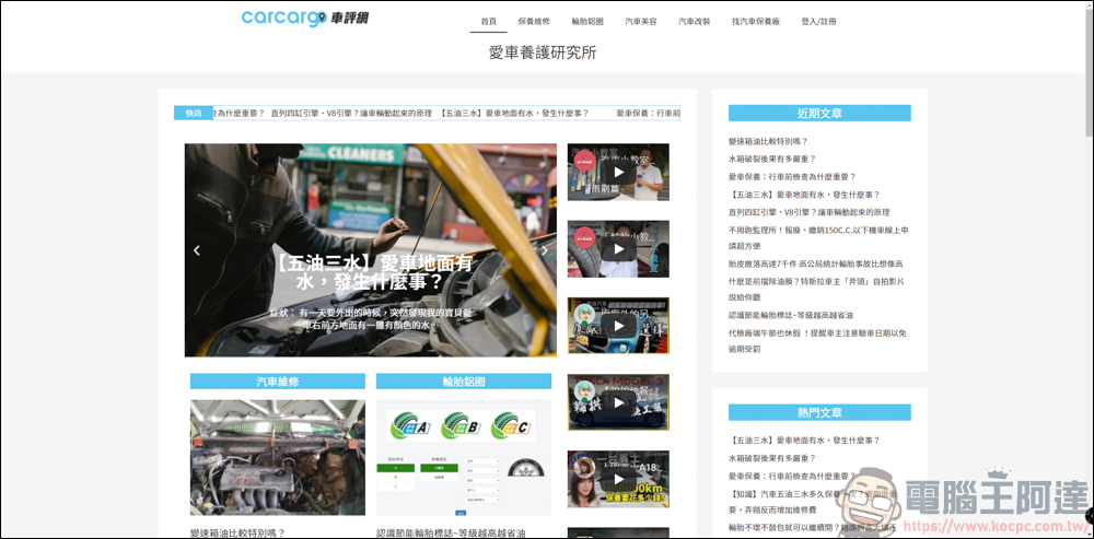 對於汽車保養、美容較不了解的消費者,carcargo車評網也有提供愛車養護研究所,在上面你就可以找到汽車保養、美容、改裝…等資料,建議如果是新車主的話一定要看一下,這邊的文章能讓你對新愛車又更深入的了解,讓你知道什麼時候該保養,遇到問題時應該怎麼解決,稍微了解一下比較好懂維修師傅在跟你說什麼,也減少被坑的機會。而且在上面也可以看到不少車評網的編輯前進到合作的店家進行採訪,透過文字、影片的方式,讓你更了解各保養廠的服務內容、設備,讓每位消費者在找保養廠之前,先行觀看做足功課: