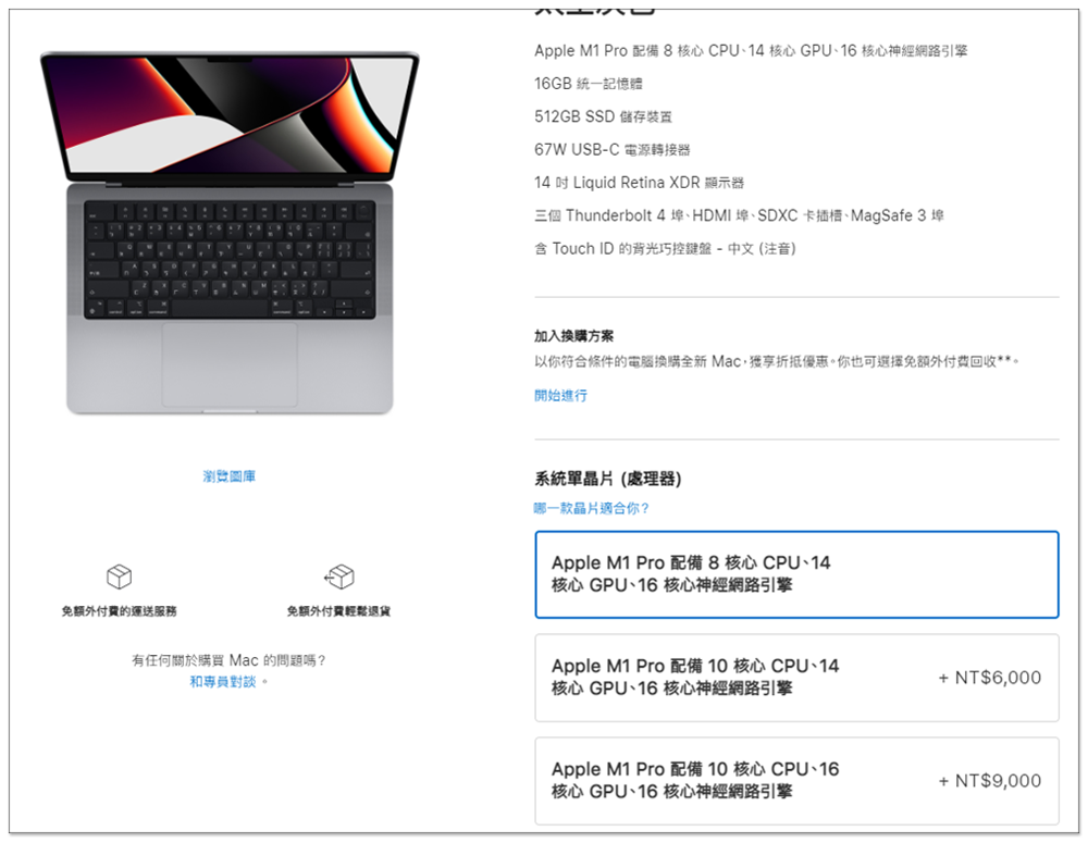 新款 14 吋 MacBook Pro 入門款的建議售價為 NT$59,900,雖然也不便宜,但這台 M1 Pro 晶片不是完整版,CPU 與 GPU 都有減少 2 顆,變成 8 核心 CPU 與 14 核心 GPU,如果想變成完整版,就必須多付 NT$9,000: