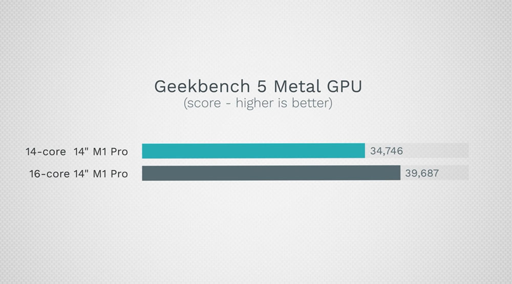Metal GPU 結果就沒差那麼大,14 核心 M1 Pro 的 34,746 分數,僅比 16 核心的 39,687 分少約 14%: