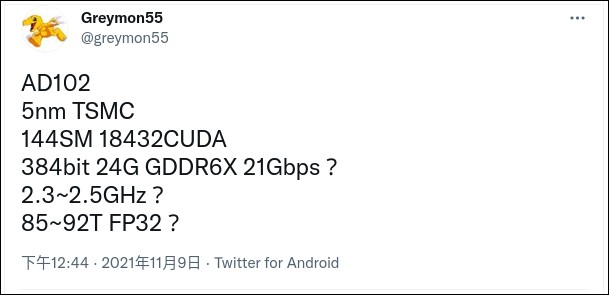 雖然顯卡的供需情形非常險峻,但 NVIDIA 顯卡的效能表現仍然得到許多好評,RTX 3000 的銷售量雖然一樣被礦工們衝高不少,卻也讓許多準備換卡的玩家注意到這個系列的表現。打鐵要趁熱,NVIDIA 理所當然的已經在規劃下一代顯示卡。只是目前一切消息都在保密階段,等到發表日才能一口氣放出消息。但仍然有爆料達人捕捉到一些八卦消息。一位推特帳號為 Greymon55 的用戶就暗示了一段話:「Double performance, double power consumption, can you accept it?」: