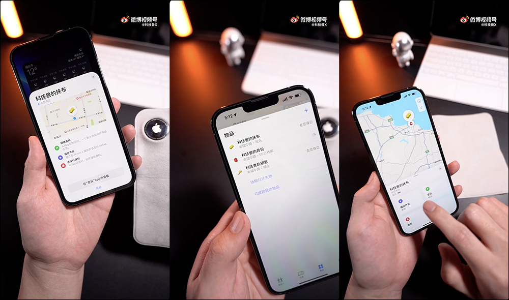 最後,當找不到這條「升級」的 Apple 擦拭布,只要拿出 iPhone 開啟「尋找」功能就可以查看它的位置。當然也可以點選「播放聲音」讓 AirTag 發出提示音,協助自己更快找到它。