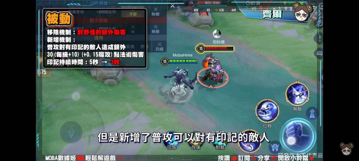 被動對野怪的額外傷害移除,但是新增了普攻可以對有印記的敵人,造成額外傷害的機制,印記持續時間從5秒減少為3秒。