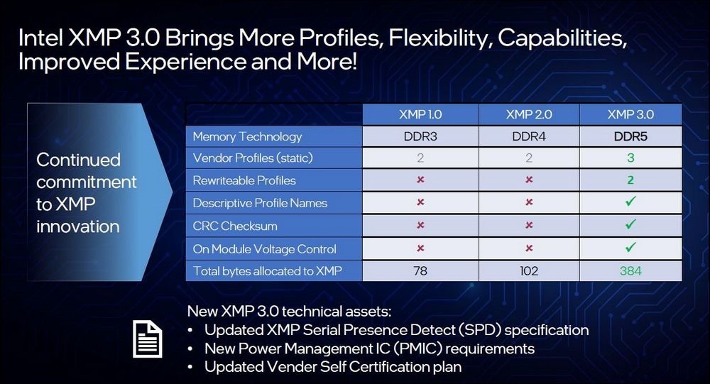 在記憶體方面迎來了全新的DDR5,而在超頻部分Intel也有新的XMP 3.0規範,簡單解釋一下Intel XMP是一個可讓記憶體廠預先寫好超頻定義檔(Profile),藉由主板BIOS載入後一鍵提升記憶體效能的設定。