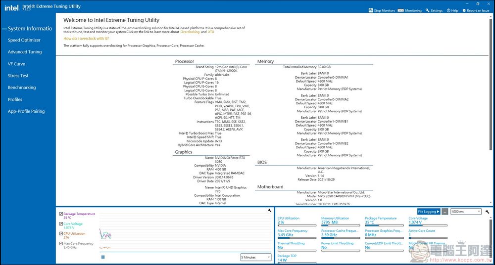 如果你對於直接在BIOS裡面調整頻率等相關設定沒有把握的話,也可以於安裝完作業系統之後,下載intel的XTU超頻調整工具軟體來使用,這是intel自家所推出的軟體,高度整合了其他第三方的類似軟體功能,如系統詳細資訊、即時監控、超頻優化、電壓調整,也包含了benchmark以及壓力測試等功能,非常的方便。