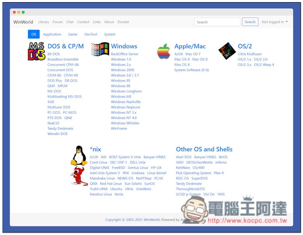 共有 5 大分類:「OS 作業系統」、「Application 應用程式」、「Game 遊戲」、「DevTool 開發工具」、「System 系統工具」,作業系統不僅提供常見的 DOS、Windows 與 Linux,連 Mac、GEM、VMS 等都有,而且是多個版本,像是 Windows 部分就能找到 1.0、2.x、2000、95、98 等: