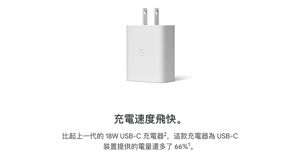 說到消費者對於 Pixel 6 系列關於速度方面的期待,其實並不只有對 Tensor 處理器的效能,也包含了當初謠傳階段提到的「歷代最快充電規格」的期待。而來到正式發表時,Google 雖然有宣稱快速充電至 50% 與 80% 的時間分別僅需 30 分鐘與 1 小時,還列出了以 30W「充電器」可支援快充的宣傳用語。