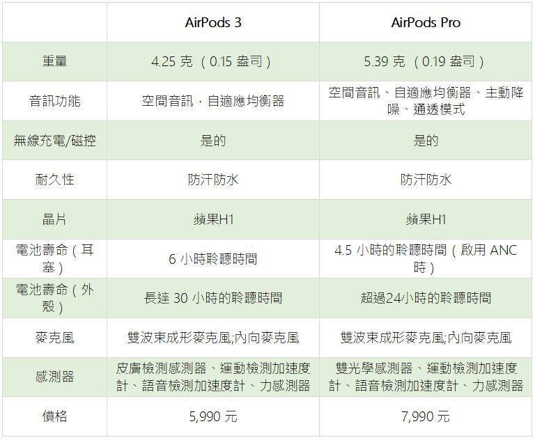 新款 AirePods 3 與 AirPods Pro 之間最主要的差異是在「主動降噪」上,此一功能是價格較高的型號所獨有功能,但與前一代的 AirPods 2 相比卻有更好的音訊和明顯有進步的低音。首先下面我們先來看看硬體規格的必對部分: