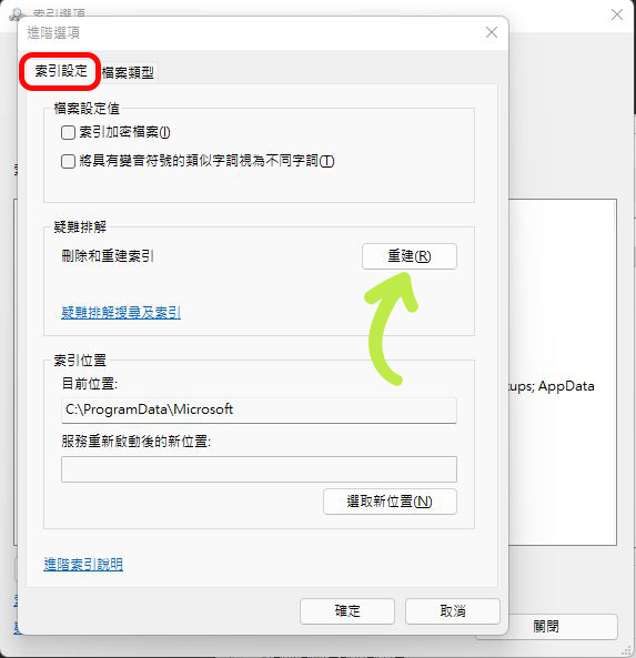 - 選好檔案類型後,回到「索引設定」分頁,點選「刪除和重建索引」這個項目後面的「重建」按鈕即可重新生成搜尋索引,重新生成的索引中會移除掉你所選定要排除的檔案類型。
