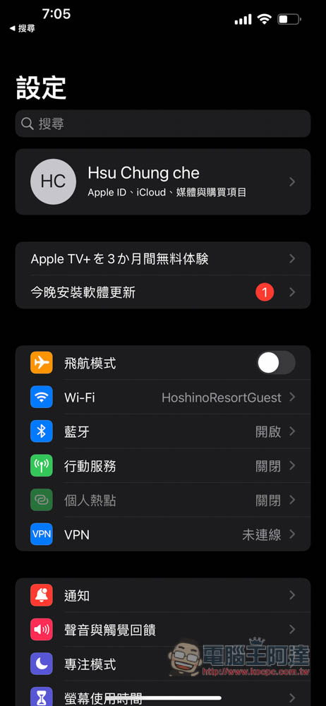 接著還需要關閉另一個選項,回到設定首頁,點擊最上方的 Apple ID(也就是顯示你名稱那一個):