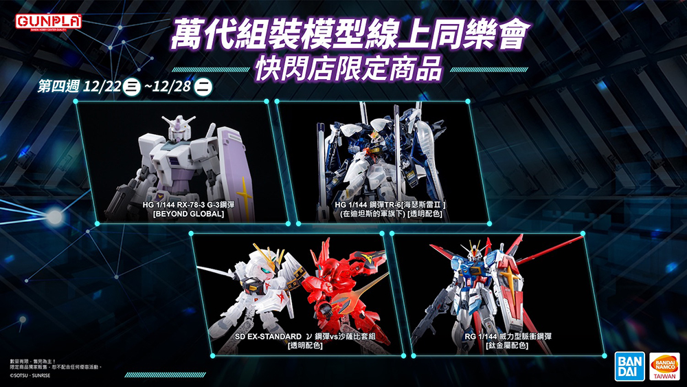 對資深玩家還有更精采的唷!除在線上快閃店中固定展售的期間限定商品外,還會每週輪番推出超人氣組裝模型限定品,限量又限定發售的萬代模型商品中,連續四週都有新鮮貨,限定商品要搶要快: