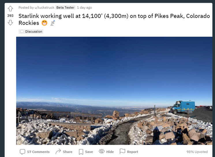最近在 Reddit 論壇上,一位 u/tuckstruck 用戶就分享他在美國派克峰山上的實測結果,一開始他寫到:「Starlink 在科羅拉多州落基山脈派克峰頂 14,100 英尺(4,300 米)處運行良好」,並沒有提供測試圖: