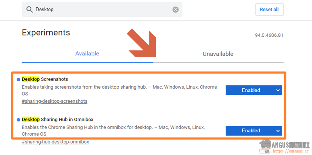 首先在 Chrome 網址上輸入「chrome://flags/」開啟 Chrome 實驗性功能的頁面,然後搜尋「Desktop Screenshots」、「Desktop Sharing Hub in Omnibox」這兩項功能,並且將「Default」預設值改為「Enabled」並按下「Relaunch」重新啟動瀏覽器即可開啟隱藏截圖工具功能。