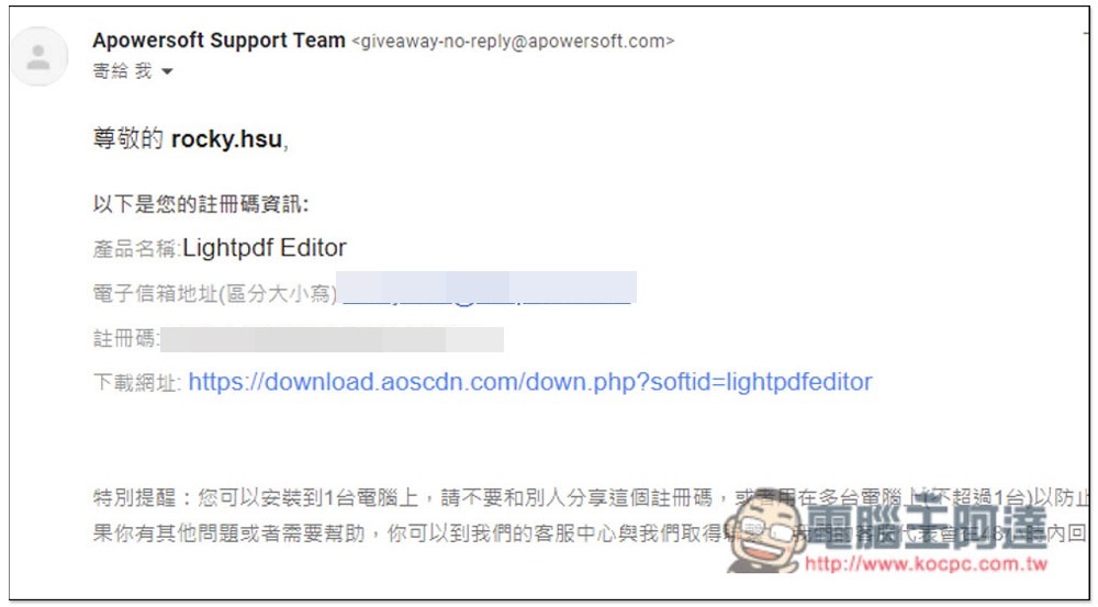 你的信箱就會收到註冊碼信件與載點,先下載安裝,等等還需要到網站後台兌換:
