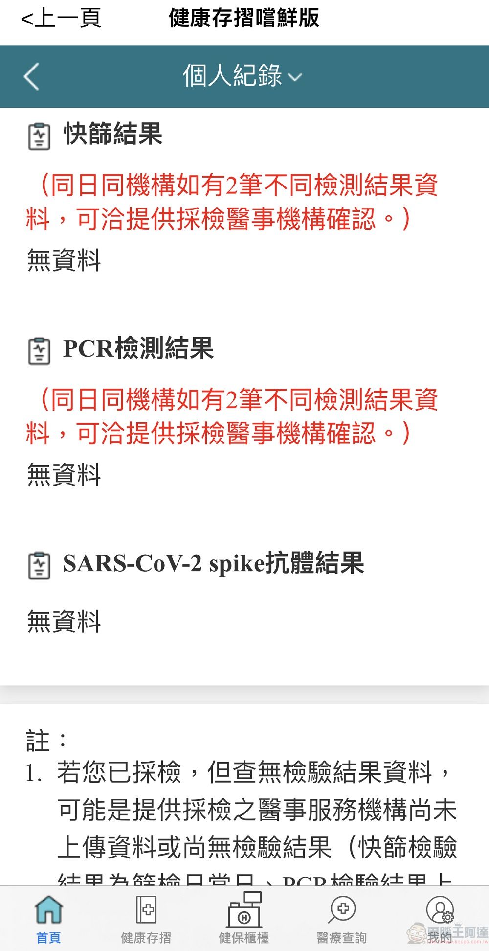 點進去後能看到「COVID-19疫苗接種/病毒檢測結果」與「就醫總覽」等兩個資訊,「COVID-19疫苗接種/病毒檢測結果」可查找COVID-19快篩等資訊。