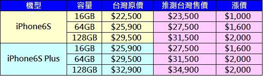 若台灣iPhone 6S與iPhone 6S Plus售價比先前iPhone 6與iPhone 6 Plus售價貴台幣1,000元,最熱門iPhone 6S Plus 64G與台灣已公布iPhone 6 Plus 64G只貴2,000元,這在過去蘋果不同iPhone機型的訂價從未見過,可能性很低。若以香港公布的iPhone 6S/6S+ 與iPhone 6/6+價差為800~900港幣(折合台幣3,360元~3,780元來看,台灣iPhone 6S/6S+ 與iPhone 6/6+價差至少會是台幣3,000~3,500元才算合理。