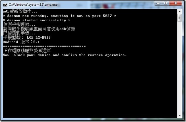 如果步驟正確就會跳出偵測到手機型號,並要求您執行手機還原指令的動作: