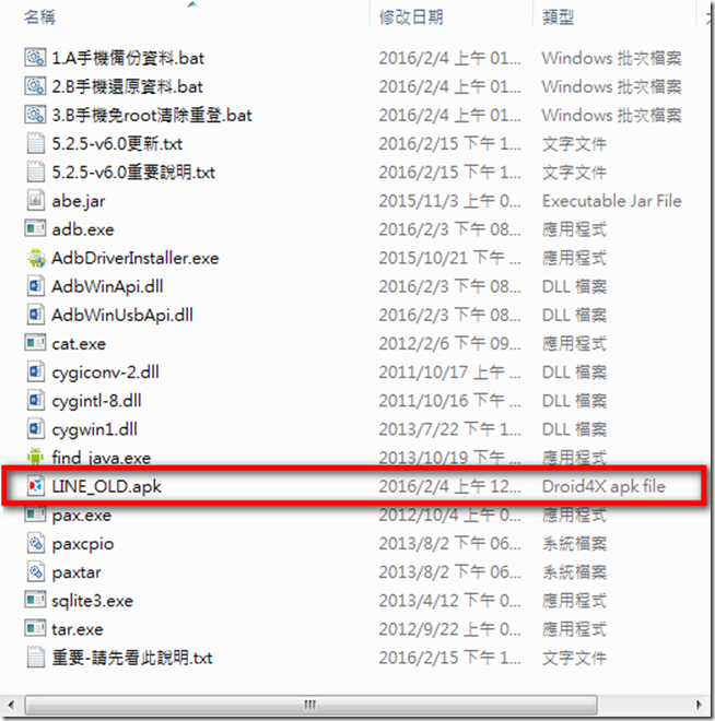 首先要下載備份軟體(主要載點/分流載點),並且解壓縮,下載解壓縮完成後,會看到資料夾內有很多檔案。此時還要下載「LINE_OLD.apk」,將LINE_OLD.apk放在備份軟體的資料夾中,資料夾內一定要有這些檔案才能執行: