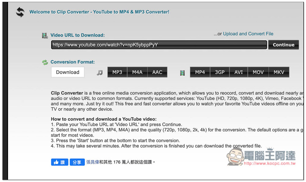 Clipconverter 的使用方式很簡單,進到網站之後,就把你要下載的 YouTube 網址貼上,然後按 Continue。另外有一點要注意是,這網站每按一次頁面或功能,都會出現彈跳視窗,可直接灌掉: