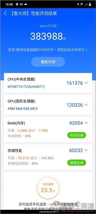 安兔兔 V9.2.6 版測得 48.7 萬分成績,魯大師則有 38.3 萬分表現,比一般中階機優異,玩坊間的一般手遊沒什麼太大問題,而且遊玩一段時間後機身的溫度也沒有什麼太大變化: