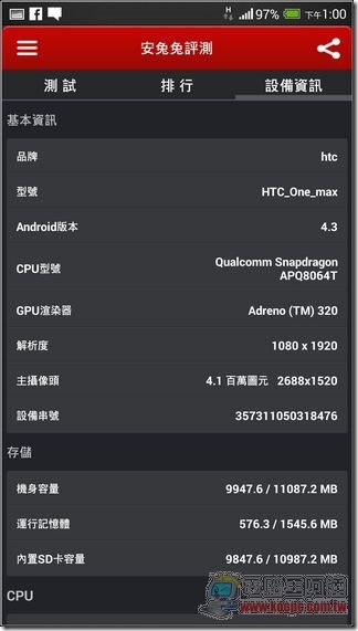 廢話扯得有點多,直接來看硬體規格,在處理器方面阿達使用了好幾套軟體,不知道為什麼都無法正確抓到One max處理器的正確型號,但時脈上的確是1.7GHz,所以應該是Qualcomm S600 無誤: