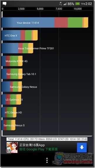 由於各手機硬體廠都有對「安兔兔評測」動了手腳,安兔兔官方另外推出了防作弊的「安兔兔X評測」(請點我下載),以下是兩者的對照前後相差了約4000分,不過 One max依然有22353分的表現:
