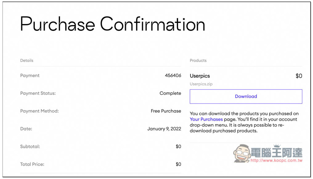 PurChase Confirmation 頁面按 Download 就會開始下載,價格為 0: