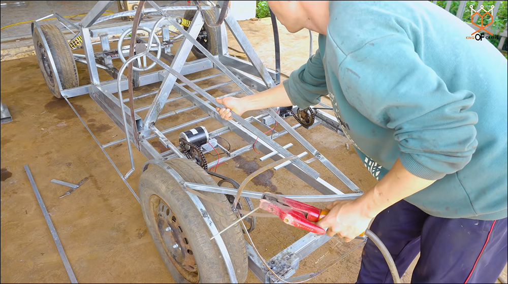 在手工「造車」的前期,他先在地上畫了車架的位置,並以鋼條作為車架,從裁切、焊接通通都親力操作。