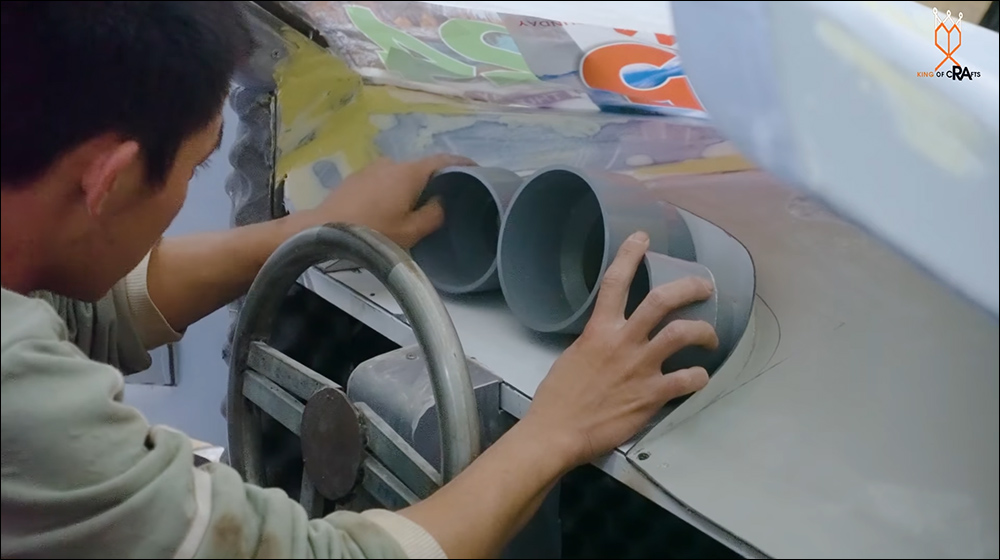 接著將 PVC 安裝上去時不斷彎折、切割、打磨等修整步驟,讓 PVC 能調整成車身外殼。
