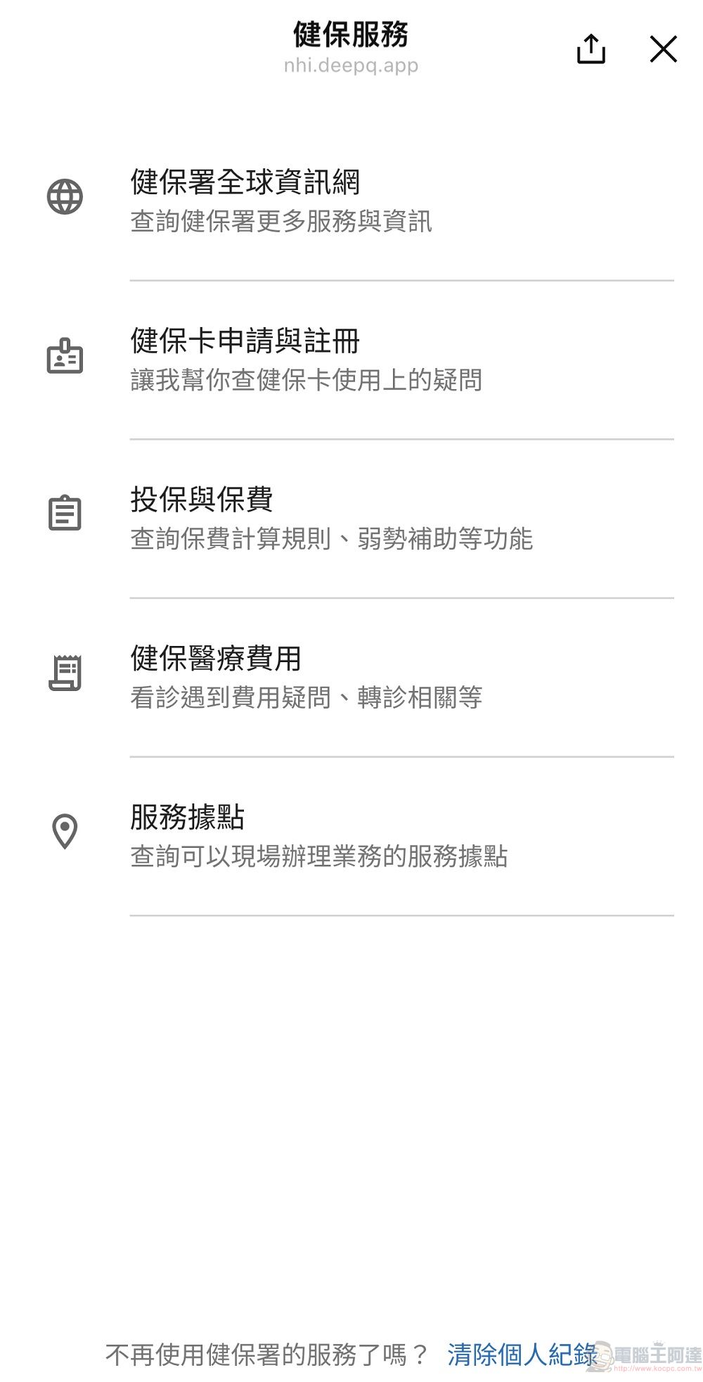 授權完成後就可使用相關功能,部分功能是便於開啟關聯的連結或功能,如「健保快易通」是在裝置已安裝健保快易通APP的狀況下,即可直接開啟「全民健保行動快易通|健康存摺APP」,使用健康存摺;「健保署FB」是直接開啟健保署FB;「健保服務」是將民眾常用之健保服務連結集結,便利使用者查找,包括:健保署全球資訊網、健保卡申請與註冊、投保與保費、健保醫療費用、健保署服務據點等資訊。
