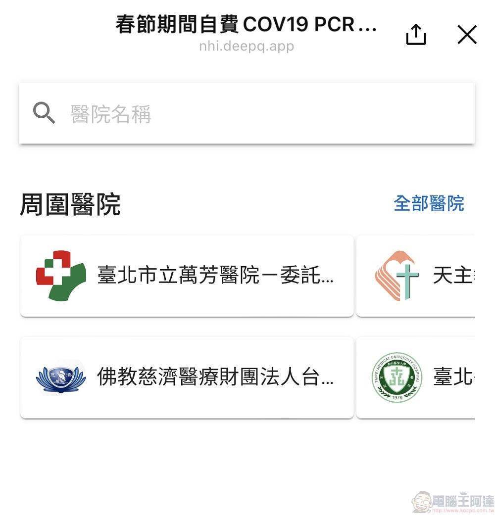 「春節期間自費COV19 PCR這裏找」則是依疾管署提供資料,提供民眾於111年農曆春節連假期間(1月29日至2月6日),直接以醫事服務機構名稱搜尋,即可得知該機構自費PCR價格、採檢模式、服務網址、電話等資訊;透過定位就能更快找尋附近可做自費PCR的醫事機構,甚至以縣市別、鄉鎮別、地圖等形式,對搜尋結果進行篩選,便利民眾查找資訊。