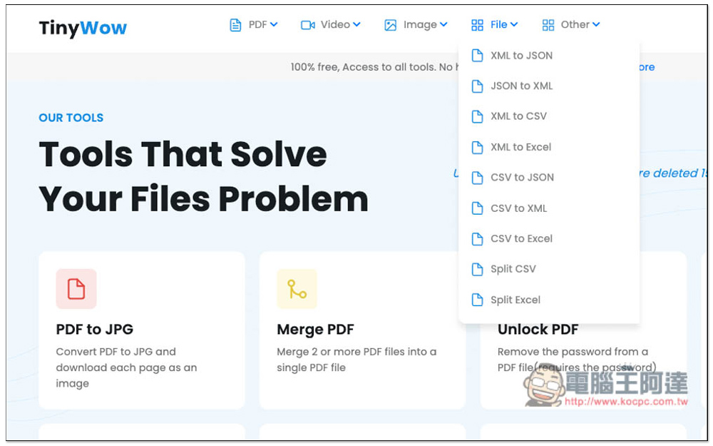 TinyWow 是一個超級佛心的網站,不僅完全免費,還沒有任何廣告,這跟其他免費線上工具很不一樣。進到首頁後下方就會列出所有提供的解決文件問題功能,不過排列上看起來沒有一個標準,因此找起來可能比較困難,我推薦從上方 PDF、Video、Image、File 與 Other 選單找會比較容易: