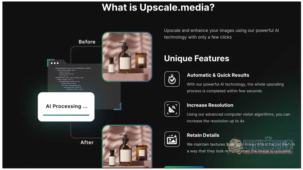 下圖是這款工具的三大特色,自動且快速的 AI 處理、提升解析度、放大後也保留細節: