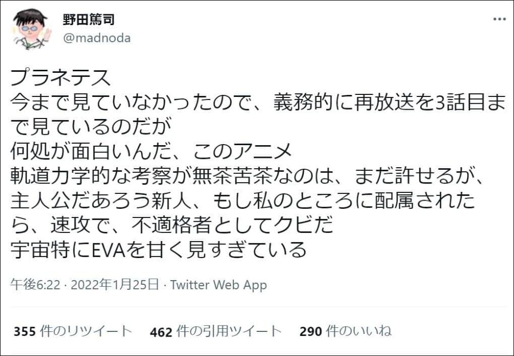 然而,不久前野田先生看到了由漫畫版改編的《惑星奇航》TV動畫之後,他就透過 Twitter 發表了自己的震怒與觀後感想,他認為,這部曾在漫畫連載期間拿下星雲賞漫畫部門獎項的名作,擁有諸多粉絲追捧,但對於自己這樣熟悉宇宙的人物看來非常無聊,甚至看了三集就感到十分難以忍受,還有的網友建議他看到第七集,之後的劇情就會好得多。