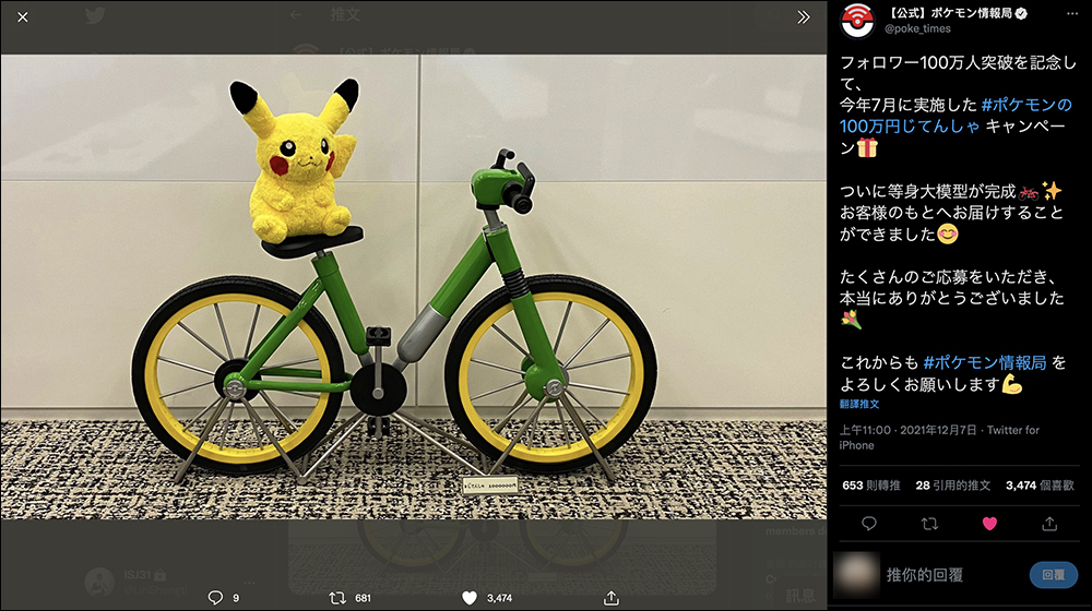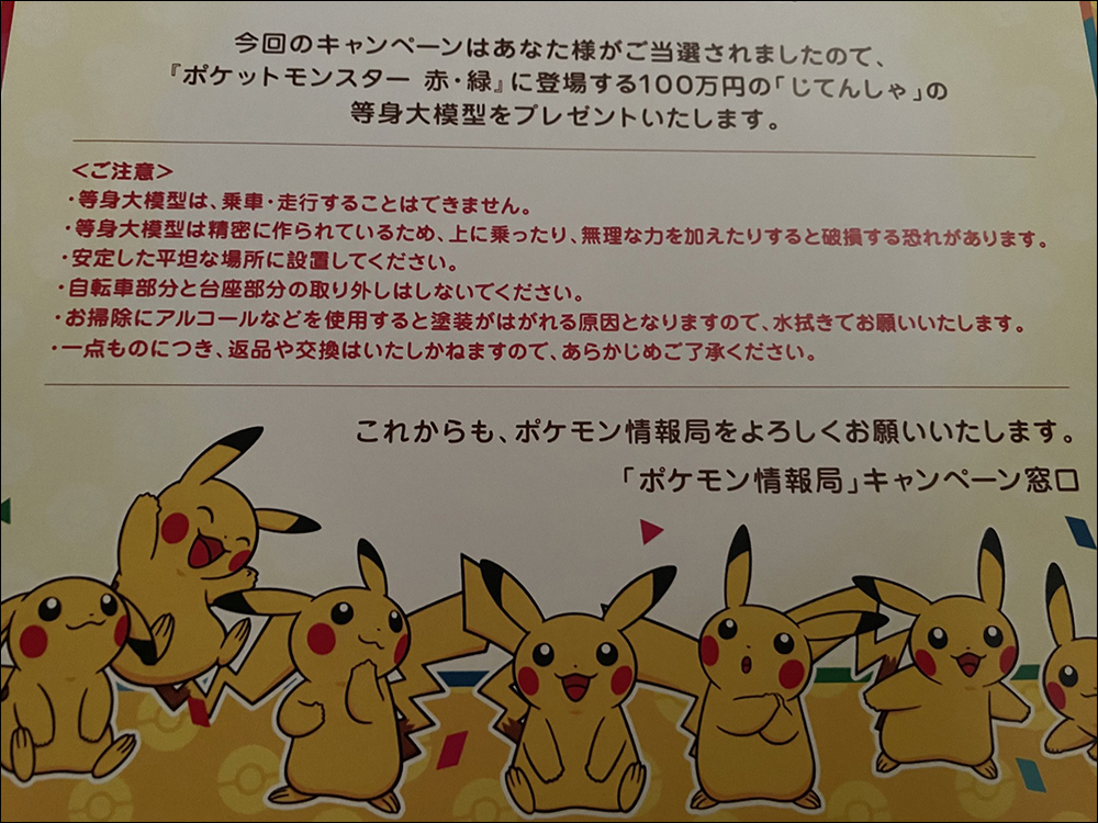 隨著此事件近日在 Twitter 不斷延燒,該獎品的得主也出面說明,不但承認自己就是那位當初中獎的人,也提到是他將該寶可夢腳踏車模型放上拍賣網站。