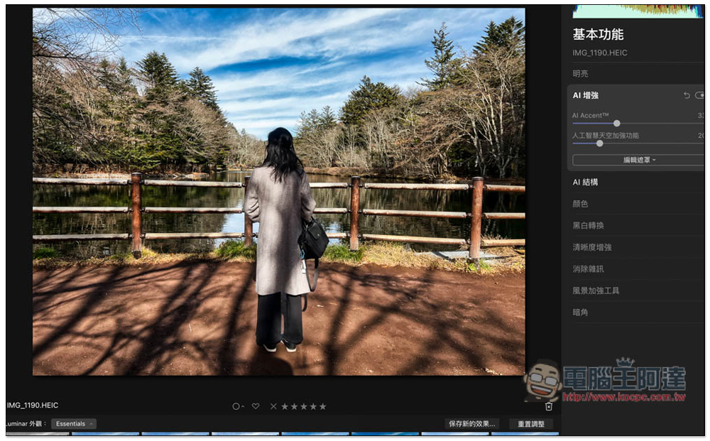 Luminar 4 有中文介面,因此應該蠻好上手的。把照片讀入之後,下方就能看到 AI Image Enhancer 一鍵 AI 修圖功能,如果 AI 修圖後的顏色你不喜歡,也可以使用其他常用的濾鏡設置: