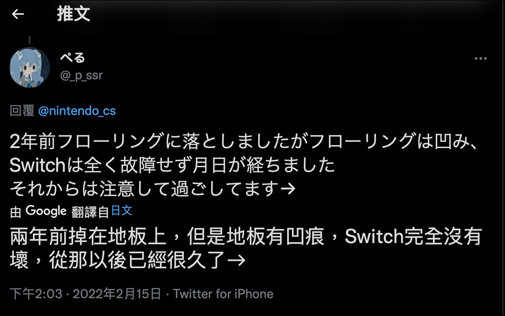 網友 @_p_ssr 回應「兩年前(Switch)掉到地板上,但是地板有凹痕、 Switch 完全沒有壞,從那之後已經很久了」:
