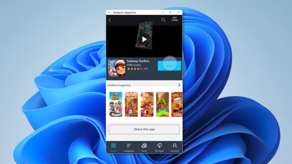 你可以從 Microsoft Store 中找尋與發現這些應用程式,但下載的部分則是由 Amazon AppStore 提供。Android 整合建立在開方式 Android 平台上,並由 Intel Bridge 技術支援,Android 的支援不僅限於 Amazon AppStore,因此你也可以手動側載其他應用程式,而無需將區域和語言切換為美國與英語。