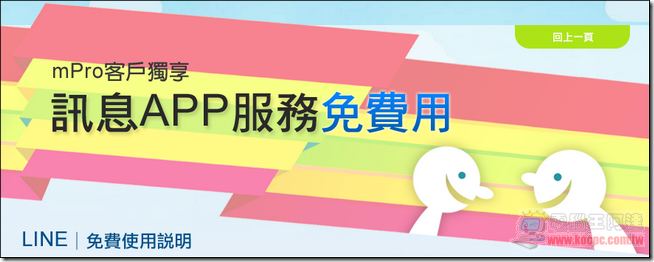 LINE最近動作頻頻,除了昨天全球破三億註冊用戶之後,今天在台灣區又投下另一顆震撼彈,推出「mPro訊息APP服務優惠包」,即日起只要是使用中華電信 mPro 上網服務(也就是一般行動上網用戶)任一資費(mPro 50/150/450/550/650/750/950)的既有客戶,無需另外申請就可以享受「LINE」傳訊服務吃到飽優惠。就算您僅申辦mPro 50,用戶也可免費傳輸「LINE」的文字、照片、影片、貼圖、聲音訊息及語音通話等訊息通通免費!不過有些部分不在免費範圍之內,詳細內容請跳轉繼續閱讀。