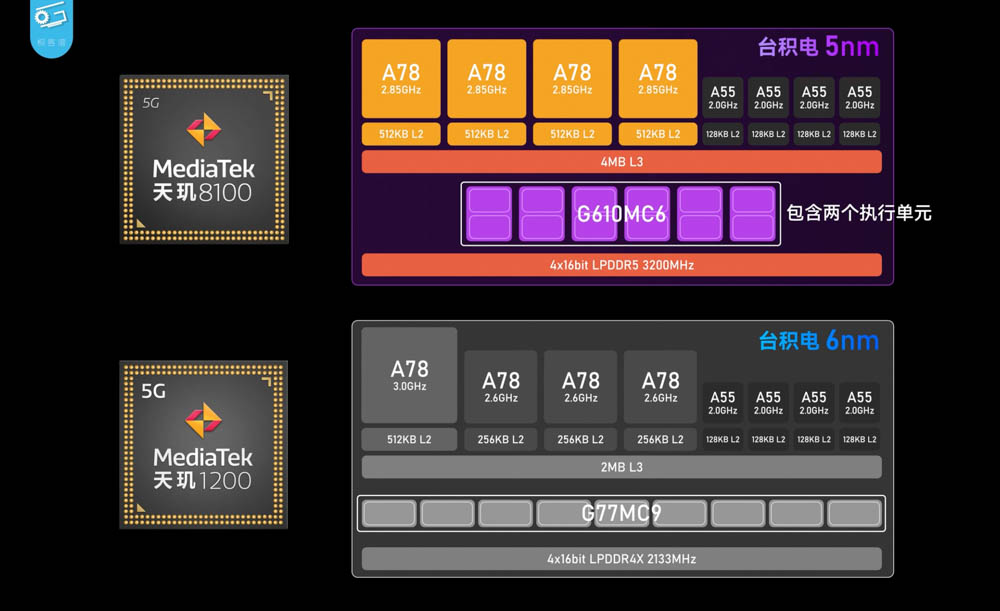 天璣 8100 的 CPU 跟天璣 1200 一樣,都是採用 A78 架構,不過都是運行 2.85GHz 時脈,且採用台積電 5nm 製程技術。 記憶體快取也提升到 4x16bit LPDDR5 3200MHz,就跟高通旗艦處理器相同,L3 也變成 4MB: