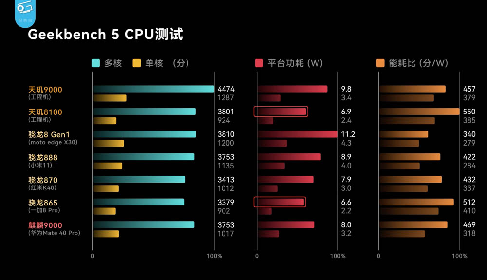 功耗部分就讓人相當驚豔了,即便是工程機,天璣 8100 多核心分數這麼高,CPU 功耗卻只有 6.9W,就跟 Snapdragon 865 差不多,幾乎是 Snapdragon 8 Gen1 的一半,能耗比更拿到 550,是所有處理器中最高,比天璣 9100 還高: