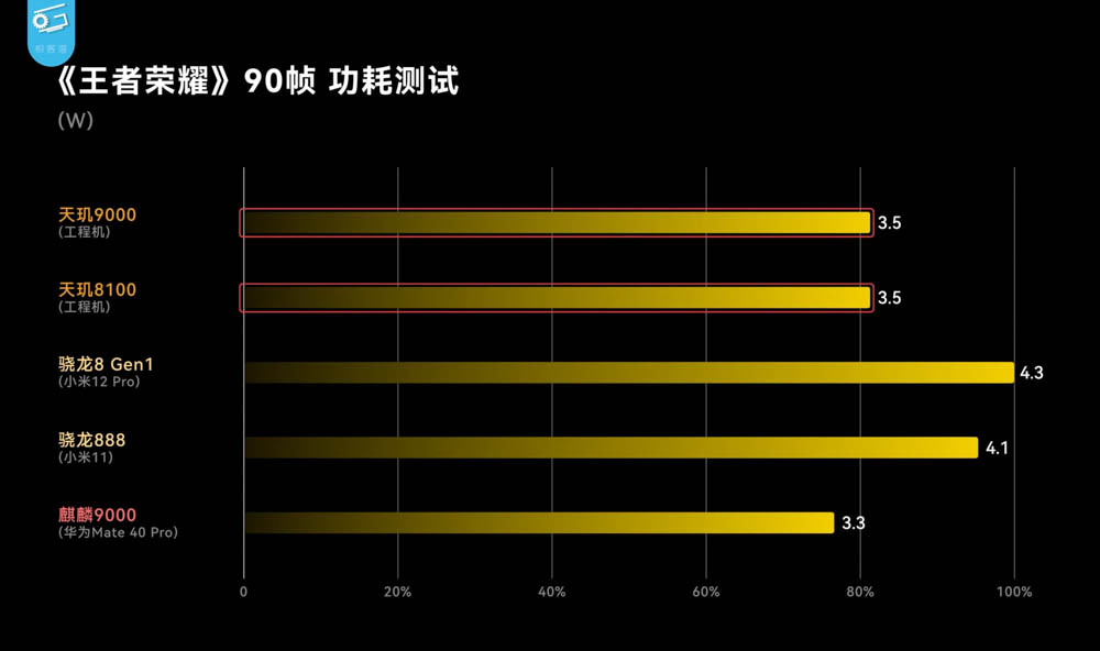 另一款王者榮耀遊戲 90 FPS 功耗測試,天璣 8100 就跟天璣 9000 一樣,都是 3.5W,遠比高通處理器還省電: