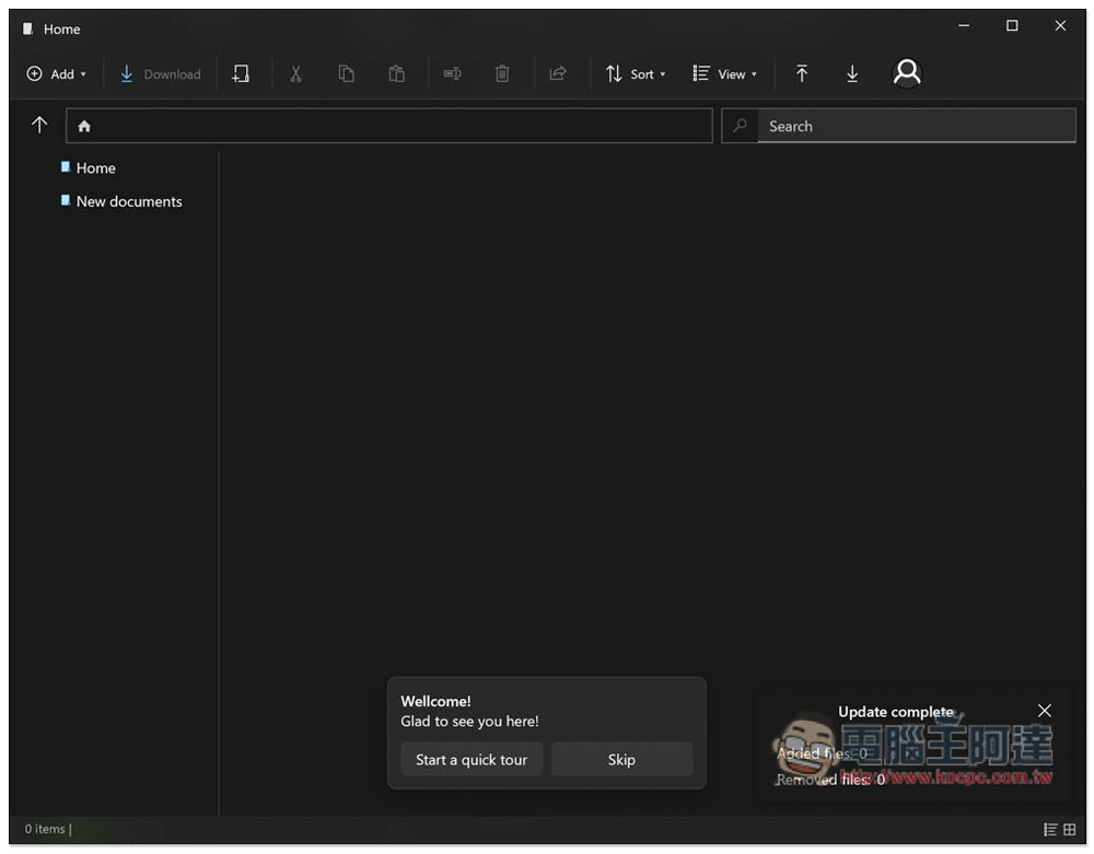 接著就能開始使用了,這款也有提供簡易的操作教學,想看的人可以按下方的 Start a quick tour,預設已經有 Home、New documents 兩個資料夾,功能表位於上方: