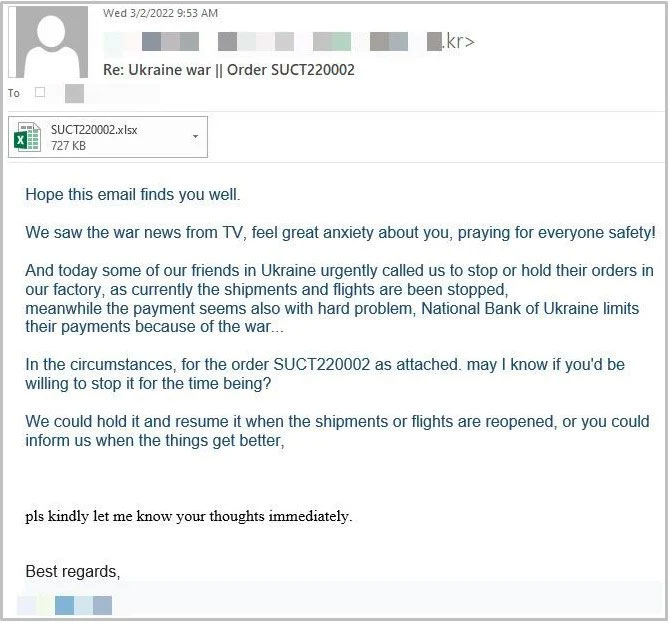 最近國際間最熱門的話題當屬俄羅斯與烏克蘭的戰爭了,全球各大企業紛紛宣布停止與俄羅斯的往來之外,很多企業由於零件生產中心就設在烏克蘭而受到不小的影響,為了能夠處理緊急情況,大家往來的信件也特別頻繁。不肖人士抓住了人們緊張惶恐的心理,打著俄羅斯與烏克蘭戰爭的名號騙你下載有問題的附件。