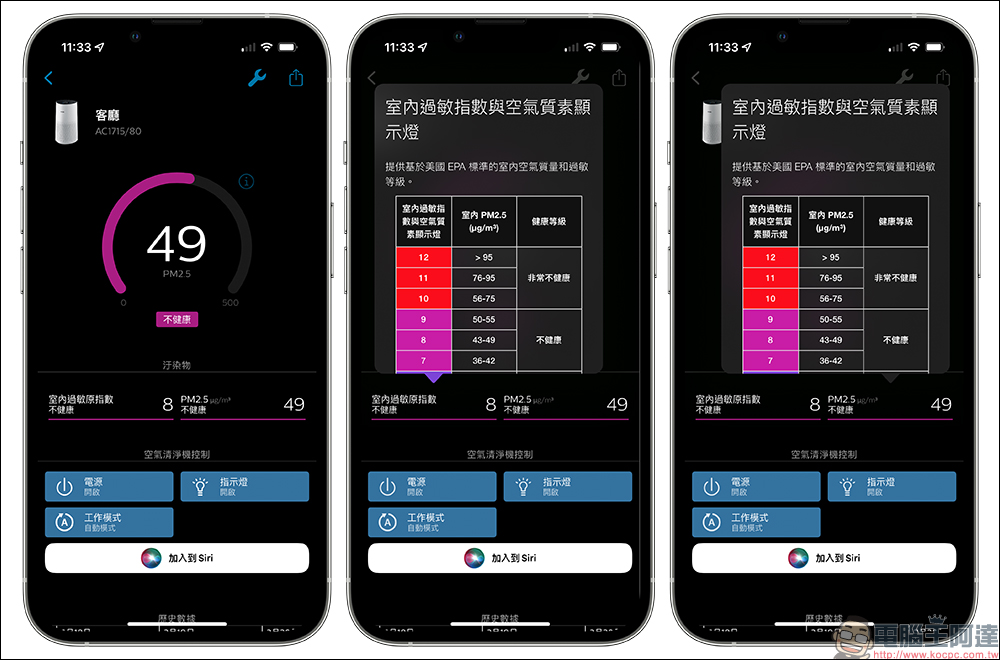 若室內空氣品質狀況不佳,除了在主機的螢幕上呈現外,也會在 App 同步顯示。